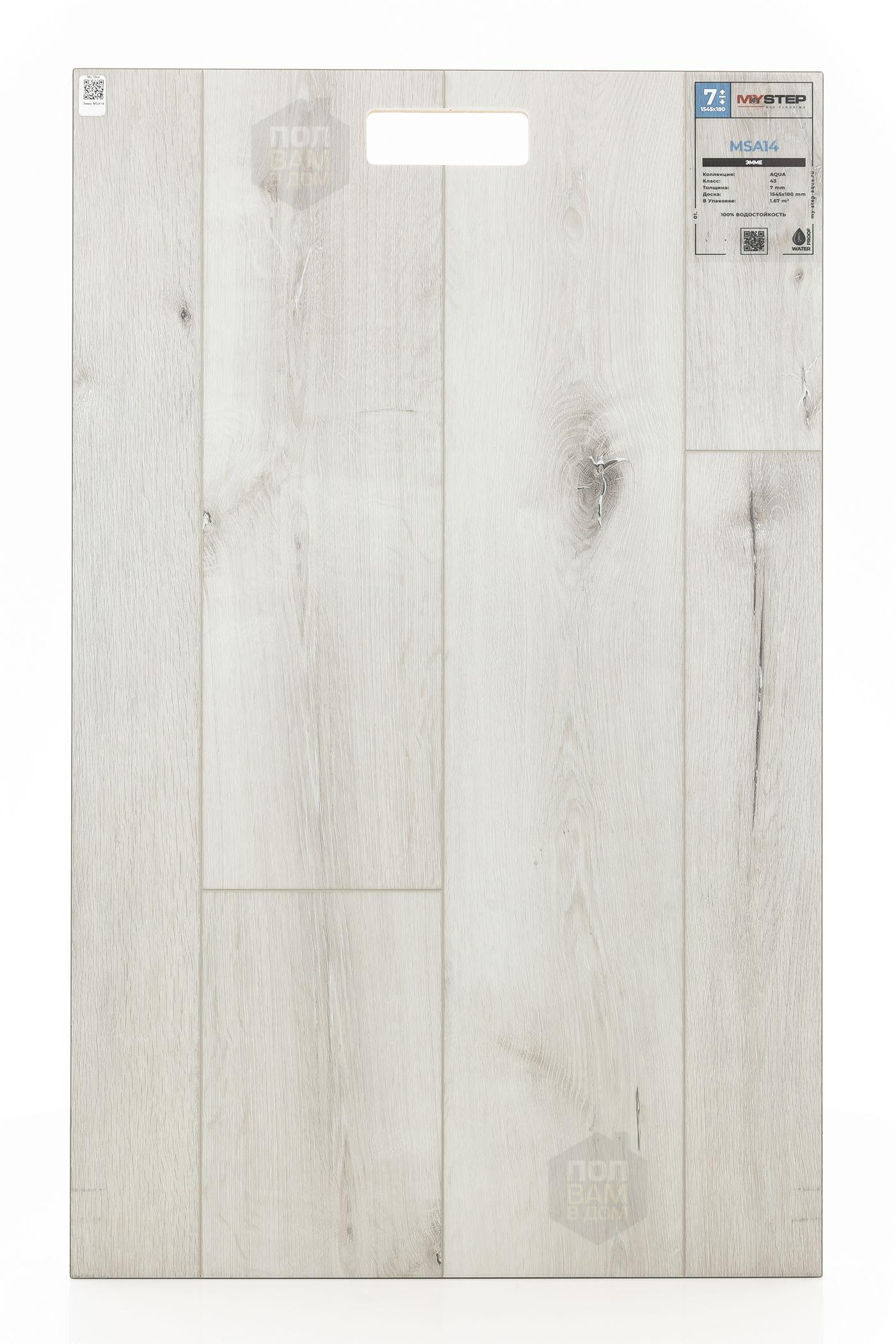 SPC ламинат My Step Эмме MSA14 - цена 3 590 руб. за квадратный метр. Это покрытие толщиной 7 мм, порода дерева - дуб, фаска с 4-х сторон. Тиснение поверхность SPC ламината имеет светлый оттенок и матовый блеск. Для того, чтобы купить в Краснодаре SPC ламинат из коллекции My Step Аква 7мм Эмме MSA14, положите товар в корзину или свяжитесь с нами любым доступным способом. Товар есть в наличии.