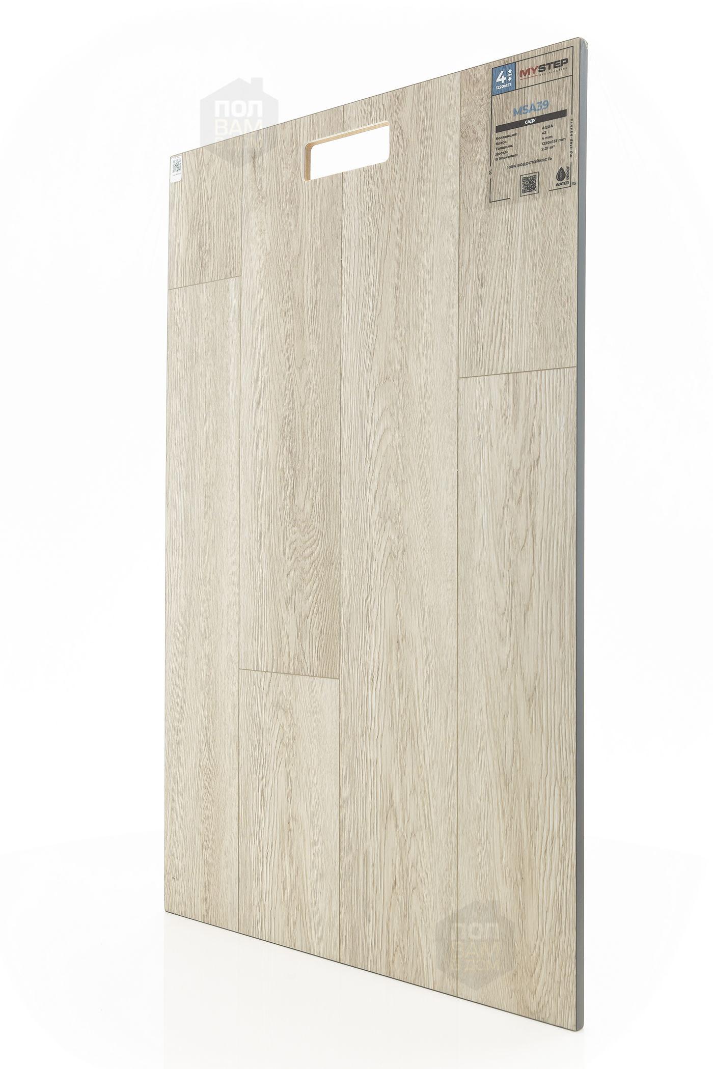 SPC ламинат My Step Саду MSA39 - цена 2 590 руб. за квадратный метр. Это покрытие толщиной 4 мм, порода дерева - дуб, фаска с 4-х сторон. Тиснение поверхность SPC ламината имеет светлый оттенок и матовый блеск. Для того, чтобы купить в Краснодаре SPC ламинат из коллекции My Step Аква 4мм Саду MSA39, положите товар в корзину или свяжитесь с нами любым доступным способом. Товар есть в наличии.