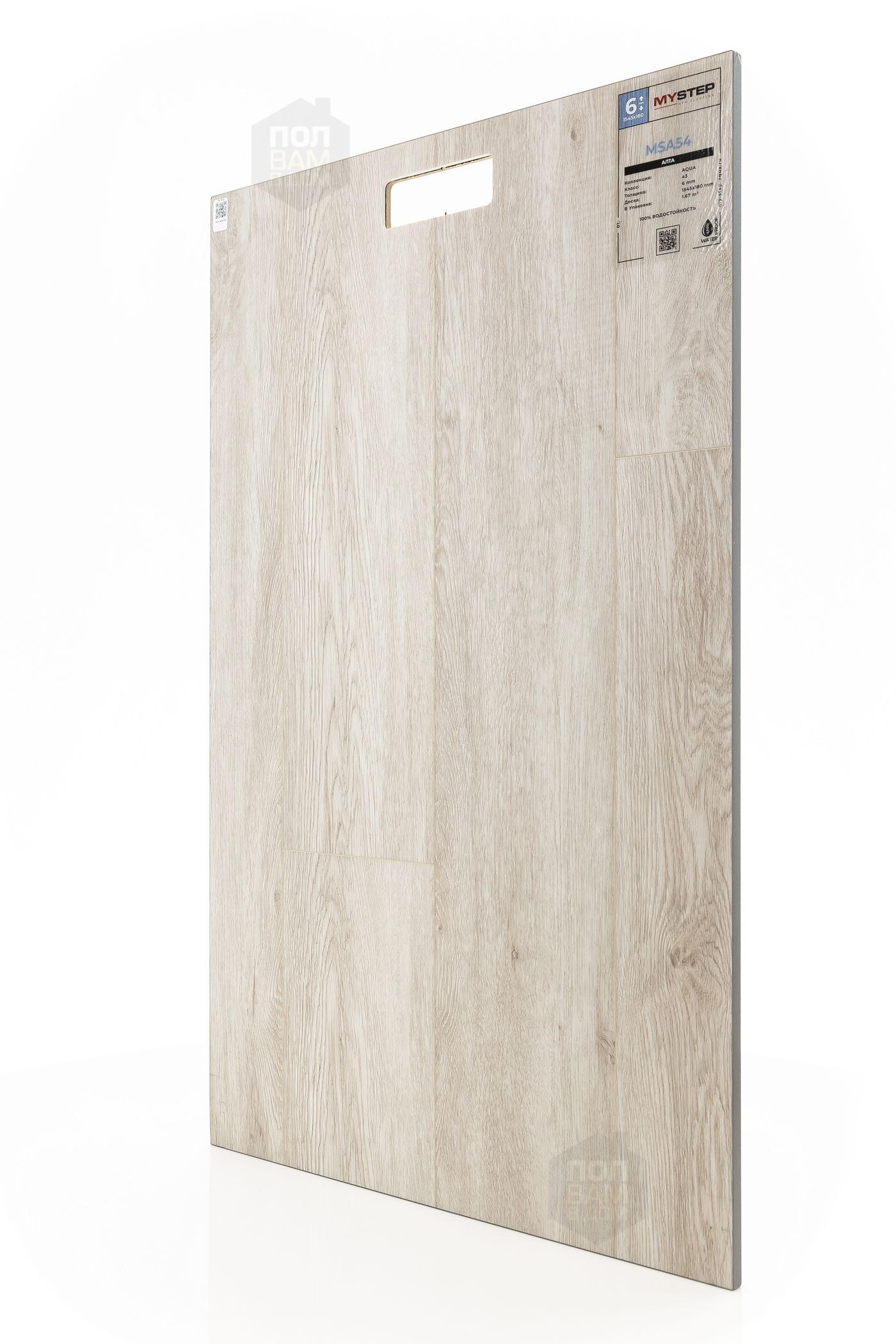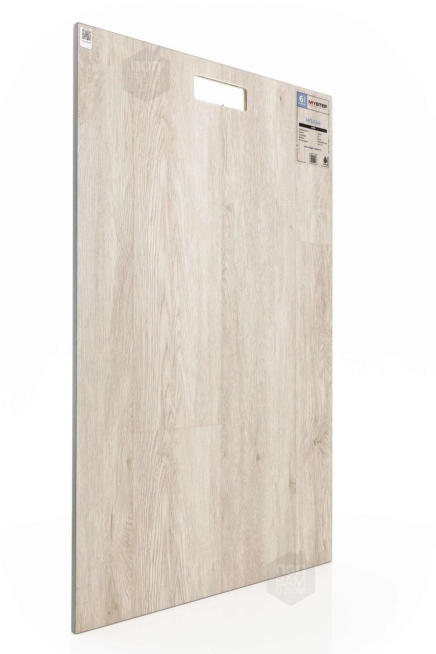 SPC ламинат My Step Алта MSA54 - цена 3 290 руб. за квадратный метр. Это покрытие толщиной 6 мм, порода дерева - дуб, фаска с 4-х сторон. Тиснение поверхность SPC ламината имеет светлый оттенок и матовый блеск. Для того, чтобы купить в Краснодаре SPC ламинат из коллекции My Step Аква 6мм Алта MSA54, положите товар в корзину или свяжитесь с нами любым доступным способом. Товар есть в наличии.